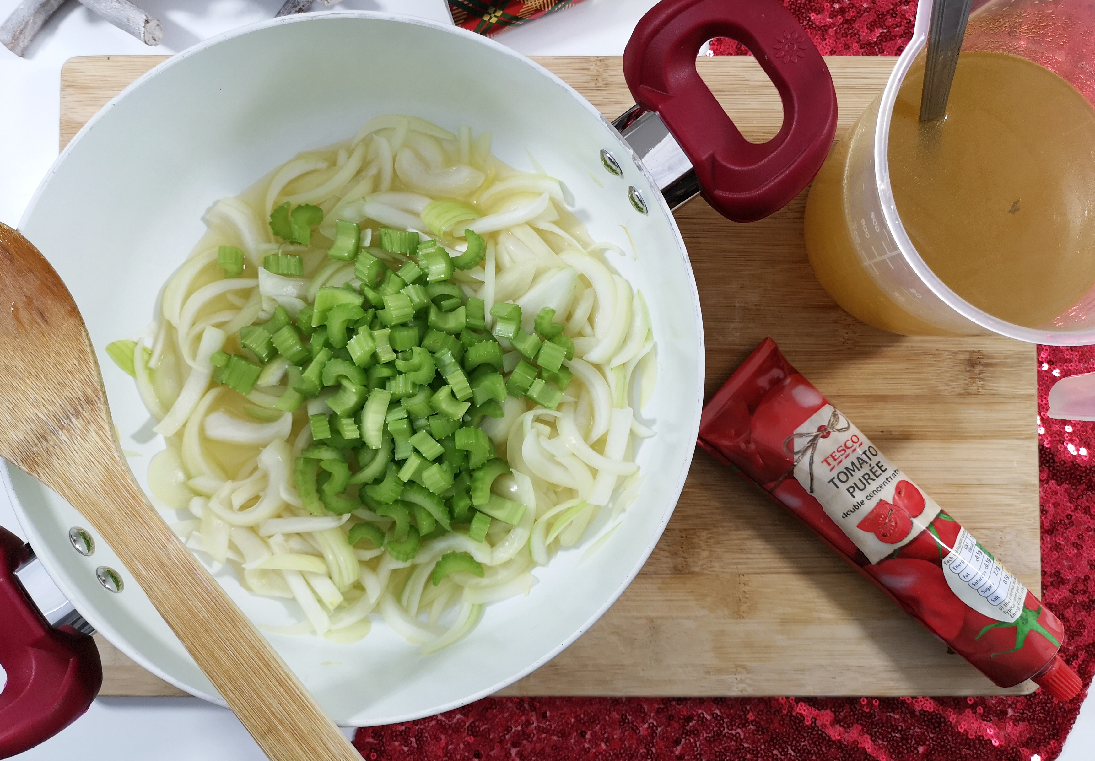 Begin by sweating the onions in about 100ml of stock over a medium-high heat. Once the liquid is evaporated, add the celery and another 100ml of stock and return to the heat.
