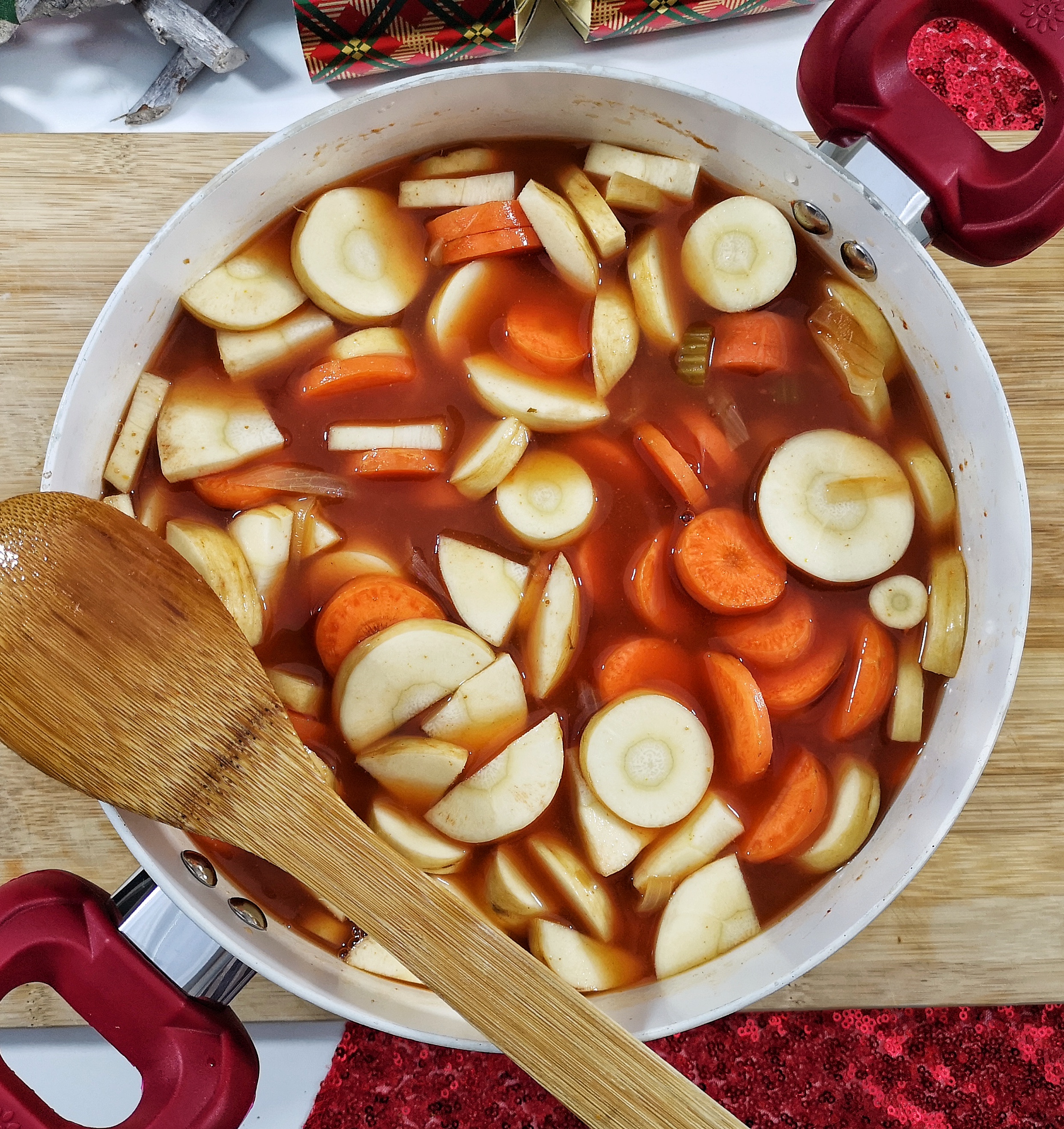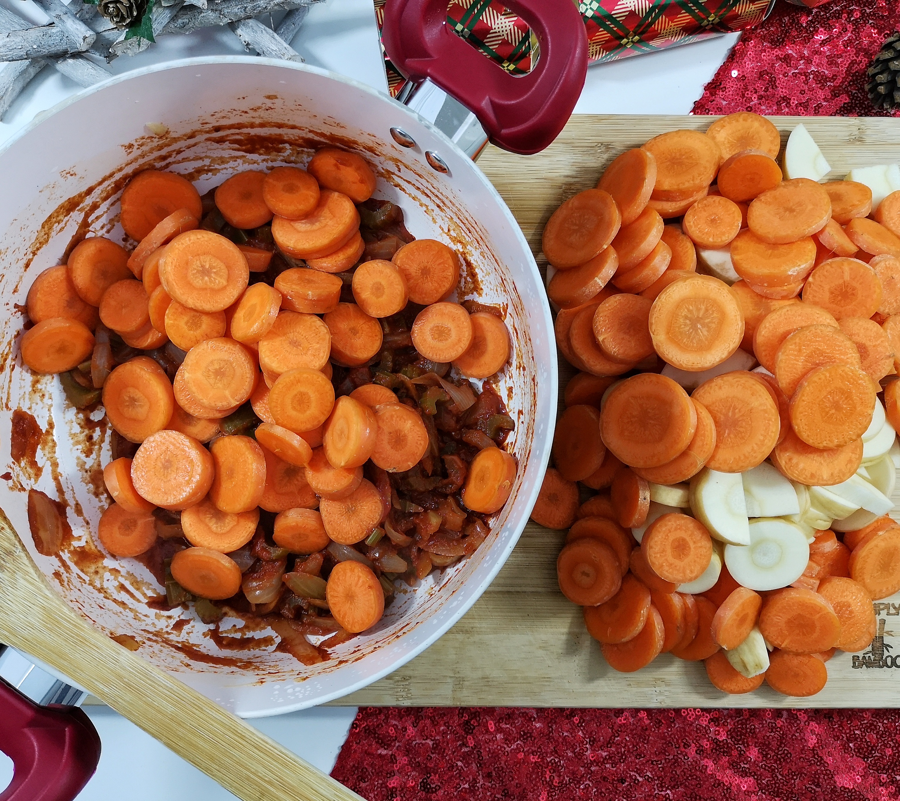 Once you have reached this consistency, add the carrot and parsnip to the pan, along with the remaining stock.