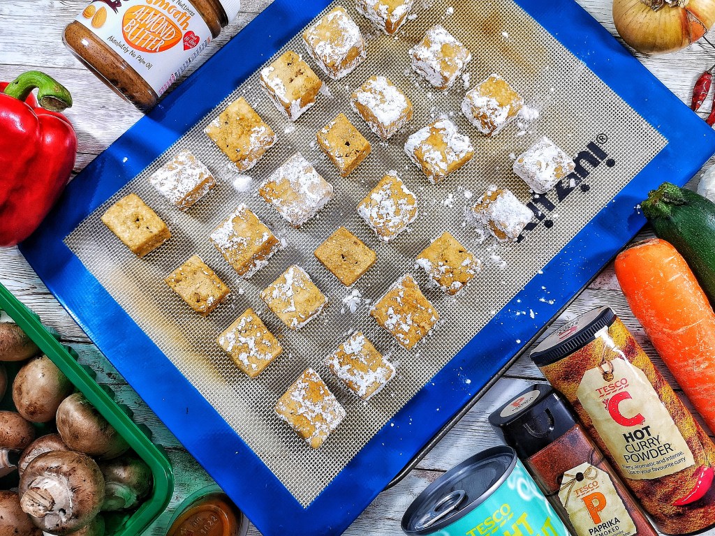Start by marinading your tofu for at least 30 minutes in a mix of the tamari and garlic powder. Then drain (but keep the garlicky tamari liquid) and roll in the cornstarch and pop in the oven at 180c (fan) for 30 minutes.