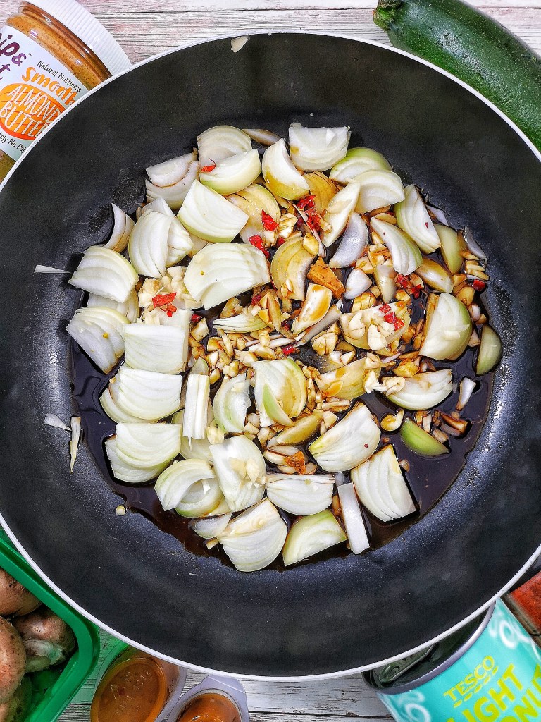 Cook down the onions, garlic and chillies in the leftover tamari mix. Once the onions are soft, add in the carrots and the curry powder and paprika and mix well. Let the carrots cook down for about 5 minutes.