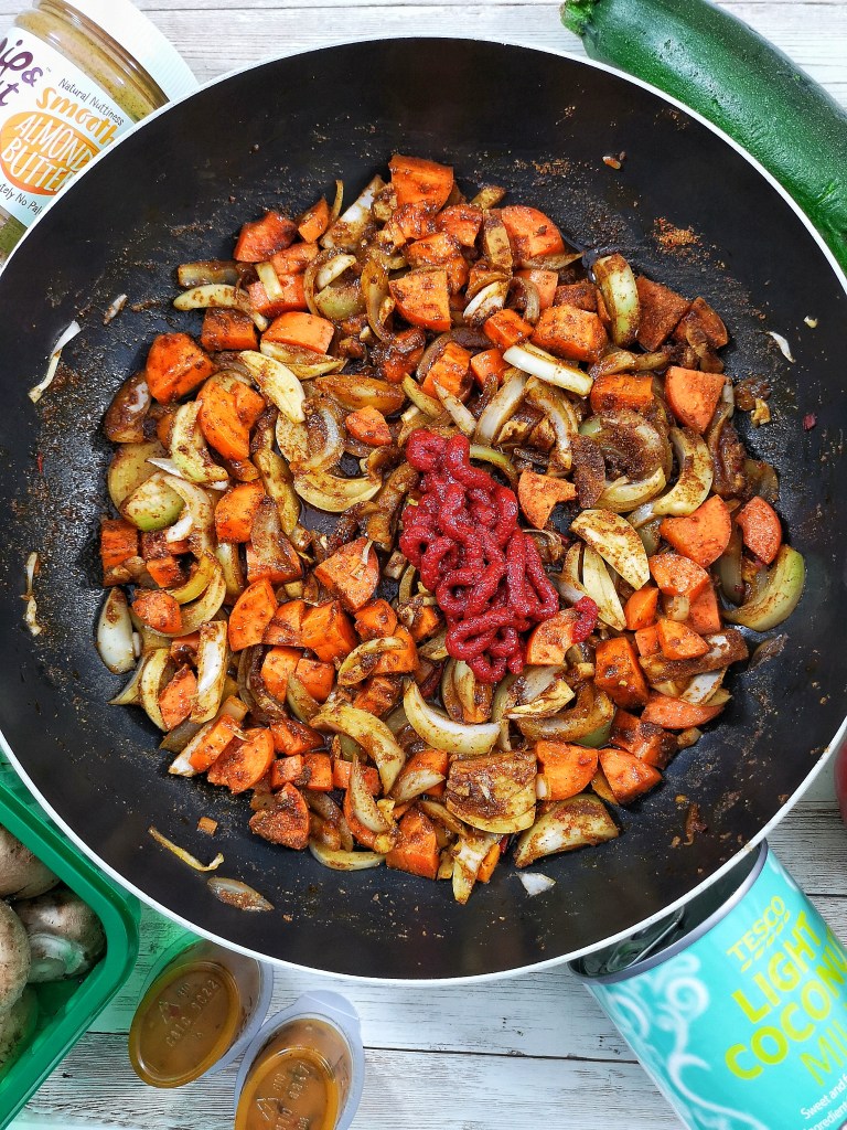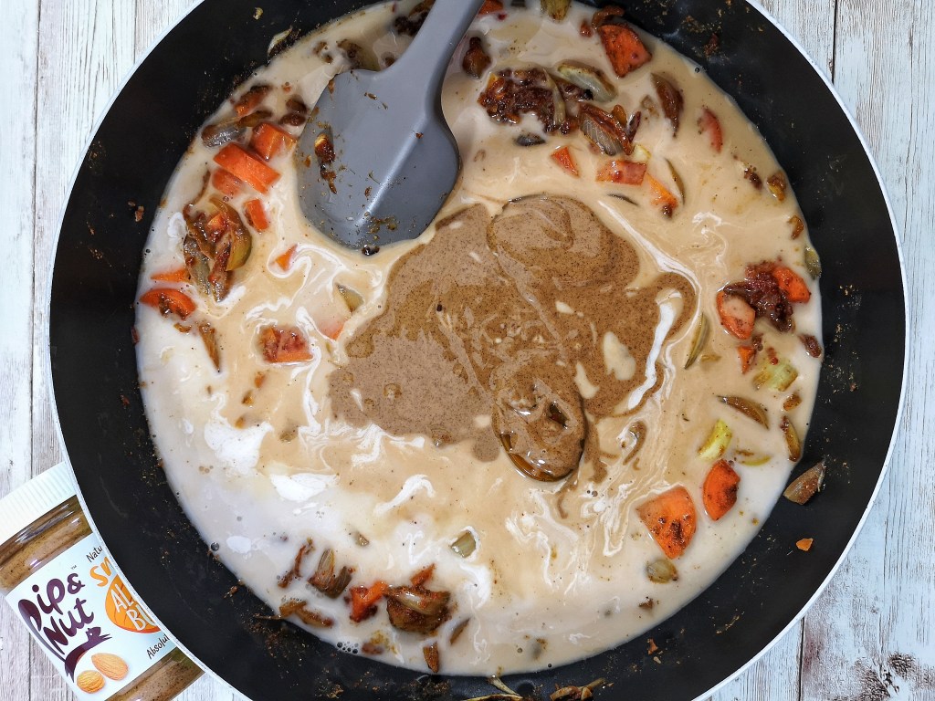 Now you can add in the coconut milk, almond butter and the stock pots/powder. Mix this in well and make sure the stock is fully dissolved before adding in the rest of the vegetables.