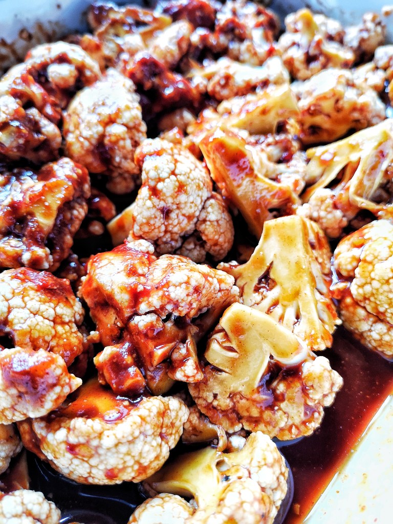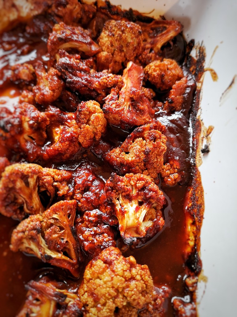 Preheat the oven to 200c (fan), then mix the tamari, passata, tomato puree, liquid smoke (or paprika), cumin, maple syrup and garlic powder well in a bowl. Next you want to cut the cauliflower into florets and transfer into an oven-proof dish. Pour over the marinade that you just mixed, and coat the cauliflower well. Place in the centre of your preheated oven for 40 minutes, mixing ever 10 minutes to ensure the cauliflower is well coated.